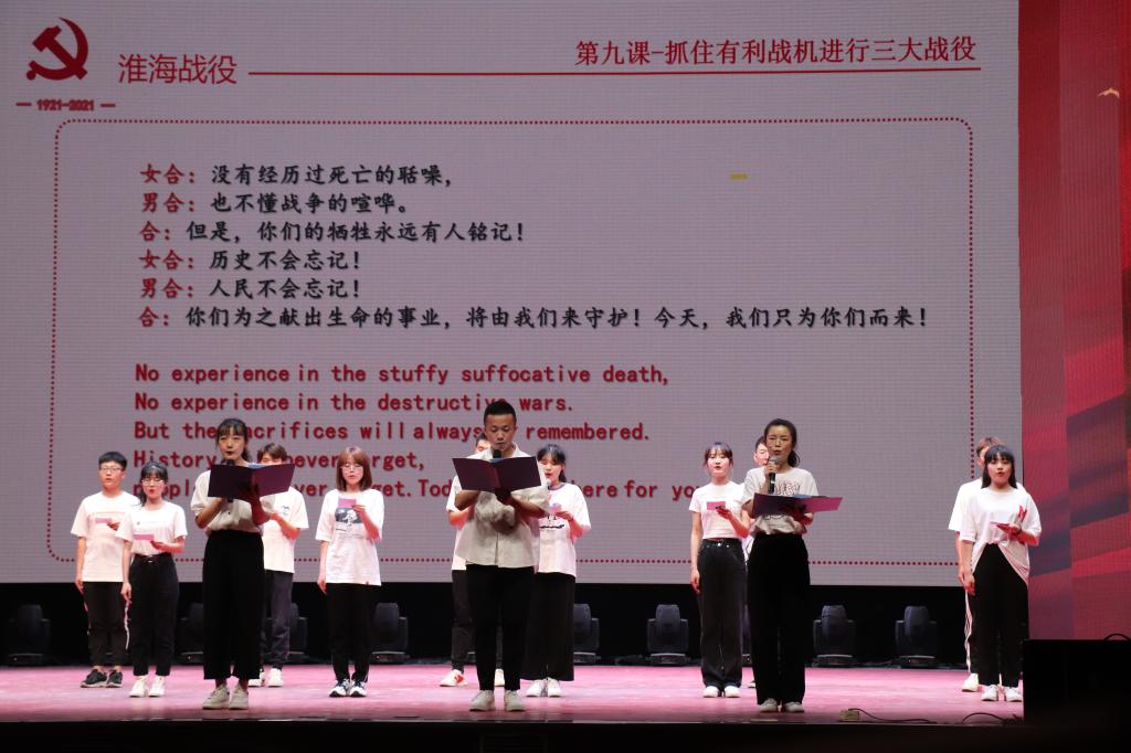 本次主题公开课充分发挥外语专业优势,通过中英双语为同学们生动的讲述党史故事。十个章节的讲解采用反转课堂的形式,将课程任务分配给一、二年级十个英语专业班级,各班员工群策群力,集体备课,搜集党史资料,全程全员参与讲述党的历史,课程讲解过程中穿插同学们精心剪辑的视频、热情饱满的歌曲、经典影视配音、情景剧、诗朗诵等形式,将中国共产党由弱到强,为争取民族独立、人民解放而不懈拼搏奋斗的精神和勇气展现在全体师生面前,具有很强的代入感,最大程度产生心灵共鸣。