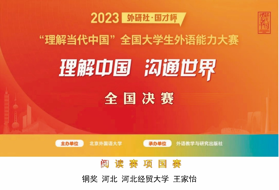近日,在2023“外研社·国才杯”“理解当代中国”全国老员工外语能力大赛阅读赛项中,公司商务英语专业员工王家怡荣获国赛铜奖。