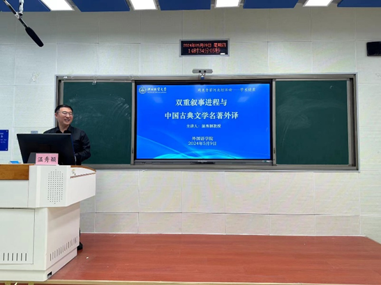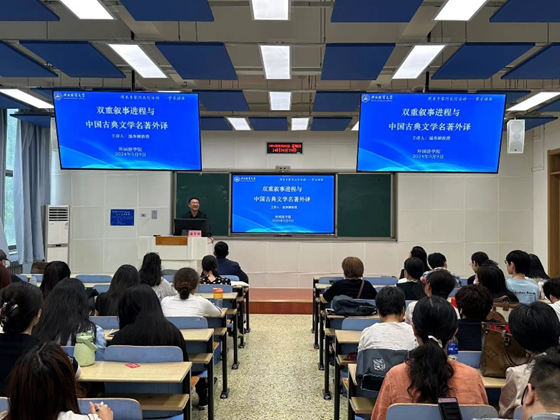 温秀颖教授的讲座题目为《双重叙事进程与中国古典文学名著外译》。他以余国藩英译《西游记》为例,引出“双重叙事进程”理论和研究模式,分析了若干英译《西游记》的具体译例。他指出要想挖掘双重叙事进程,一个是要打破批评传统的束缚,深入探索显性情节之下,剖析并挖掘对立隐性叙事脉络;同时还要关注琐碎离题的细节,重点关注这些细节与其他成分的前后呼应关系,并共同构成贯穿全文的隐性叙事进程。